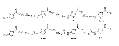 A series of novel 2-amino-1, 3-thiazole-4-carboxylic acid derivatives were designed and synthesized. Their structures were confirmed by melting points, IR, 1H NMR, 13C NMR, and HRMS or elemental analysis. Biological activities of all title compounds including fungicidal activity and antivirus activity were evaluated systematically. Preliminary bioassays indicated that these compounds exhibited good fungicidal activity at 50 μg/mL, compounds 4b and 4i exhibited over 50% activity against six fungi tested. Most compounds showed good activity against TMV with different models in vivo at 100 μg/mL. Compounds 4c and 4e stood out with high effects against TMV in vivo in all models tested, including protective, inactivative, curative, and inductive activities. These data demonstrate a new strategy for fungi and virus control.