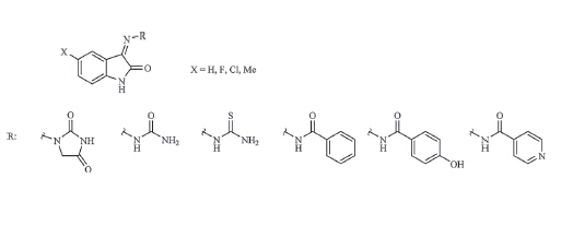 Based on the existing reports on the bioactive isatin derivatives, a number of Schiff bases were synthesized by reacting 5-substituted isatins with bioactive amines/hydrazides and their structures were confirmed using spectroscopic methods such as NMR, IR and mass spectrometry. Furthermore, N-benzylation of isatin followed by the Schiff base formation furnished a new series of compounds (11a-13c) which allowed the analysis of the effect of isatin N-substitution on the bioactivity of the resulting compounds. The antibacterial activity of the synthesized derivatives was evaluated using a microtiter plate method on a series of gram positive and gram negative bacterial strains. Compounds 2d, 3b, 5c and 6a were among the most potent derivatives against Pseudomonas aeruginosa (MIC = 6.25 μg/mL). Analysis of the structure-activity relationship showed that the incorporation of (thio)urea-based Schiff bases lead to more potent derivatives with a broader spectrum of antibacterial activity. In addition, highly lipophilic compounds such as 11a-12c did not show any measurable antibacterial activity, which implies that an optimal lipophilicity might be an important requirement for the antibacterial activity of the studied isatins. Finally, the finding that hydantoin derivatives of N-benzylisatins (13a-13c) still exhibit some antibacterial activity prompted us to consider exploring the bioactivity of more diverse derivatives of isatin-aminohydantoin Schiff bases (compounds 1a-1d) in our future studies.
