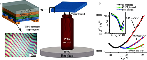 The n-channel behavior has been occasionally reported in the organic field-effect transistors (OFETs) that usually exhibit p-channel transport only. Reconfirmation and further examination of these unusual device performances should deepen the understanding on the electron transport in organic semiconductors. 6,13-bis(triisopropyl-silylethynyl) pentacene (TIPS-pentacene), a widely examined p-channel material as Au is used for source-drain electrodes, has recently been reported to exhibit electron transport when grown from non-polar solvent on divinyltetramethyldisiloxanebis (benzocyclobutene) (BCB) dielectric, spurring the study on this unusual electron transport. This paper describes FET characteristics of solution-grown TIPS-pentacene single crystals on five polymer gate dielectrics including polystyrene (PS), poly(methyl methacrylate) (PMMA), poly(4-vinyl phenol) (PVP), poly(vinyl alcohol) (PVA) and poly(vinylidene fluoride-trifluoroethylene-chlorofluoroethylene) (P(VDF-TrFE-CFE)). In addition to the p-channel behavior, electron transport occurs in the crystals on PMMA, PS, thick PVA (40 nm) and a bilayer dielectric of PMMA on P(VDF-TrFE-CFE), while does not on PVP and thin PVA (2 nm). The two distinct FET characteristics are consistent with the previous reported trap effect of hydroxyl groups (in PVP and PVA) and reduced injection barrier by Na+ ions (as impurity in PVA). The highest electron mobility of 0.48 cm2 V-1 s-1 has been achieved in the crystals on PMMA. Furthermore, the electron transport is greatly attenuated after the crystals are exposed to the vapor of a variety of polar solvents and the attenuated electron transport partially recovers if the crystals are heated, indicating the adverse effect of polar impurities on electron transport. By reconfirming the n-channel behavior in the OFETs based on TIPS-pentacene, this work has implications for the design of n-channel and ambipolar OFETs.
