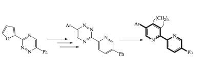 An efficient approach has been developed for the synthesis of 5,5'-diaryl-2,2'-bipyridines via their 1,2,4-triazine analogues. The notable advantages of the present method are:The possibility of varying the aromatic substituents in the positions 5 and 5' of bipyridine core and the possibility for obtaining 2,2'-bipyridines bearing a fused cyclopentene core to increase the solubility in organic solvents. These 5,5'-diaryl-2,2'-bipyridines exhibited an intense emission in a range of ca. 422-521 nm in acetonitrile solution; depending on the nature of the aromatic substituents and the presence of annulated cyclopentene fragments. Apart from that, the significant bathochromic shifts of the both absorption and emission maxima were observed in comparison with a number of previously described similar structures. In some cases the significant increasing of the fluorescence quantum yields took place.