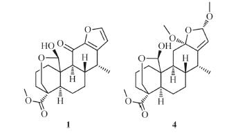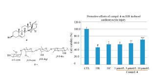 Phytochemical investigations from the roots of Cynanchum stauntonii led to obtain four new C21 steroidal glycosides (1-4) and one known compound stauntoside F (5). Their chemical structures were characterized by sophisticated analyses of IR, HRESI-TOF-MS, 1D, and 2D-NMR data, together with chemical methods, which showed interesting 13,14:14,15-disecopregnane-type skeleton or 14,15- secopregnane-type skeleton C21 steroidal glycosides. Among them, compound 1 was determined to be glaucogenin C 3-O-β-D-glucopyranosyl-(1→4)-β-D-cymaropyranosyl-(1→4)-β-D-digitoxopyranosyl- (1→4)-β-D-thevetopyranoside. Compound 2 was characterized to be hirundigenin 3-O-α-L-diginopyr-anosyl-(1→4)-β-D-cymaropyranosyl-(1→4)-β-D-digitoxopyranosyl-(1→4)-β-D-3'-demethyl-theveto-pyranoside. Compound 3 was identified to be (14S,16S,20R)-14,16-14,20-15,20-triepoxy-14,15-secopregn- 5-en-3-ol-3-O-α-L-cymaropyranosyl-(1→4)-β-D-digitoxopyranosyl-(1→4)-β-D-oleandropyranoside. Compound 4 was identified to be (14S,16S,20R)-14,16-14,20-15,20-triepoxy-14,15-secopregn-5-en-3-ol- 3-O-α-L-cymaropyranosyl-(1→4)-β-D-cymaropyranosyl-(1→4)-β-D-digitoxopyranosyl-(1→4)-β-D-thevetopyranoside. Among them, compound 2 was hirundigenin type C21 steroidal glycoside that existed in nature as epimers due to the presence of 14-hemiketal hydroxyl group in its structure. In addition, the anti-inflammatory and cardiomyocyte protective effects of compounds 1-4 were evaluated.Wefound that they exhibited significant protective effects on hypoxia/reoxygenation induced cardiomyocyte injury, but did not showed obvious anti-inflammatory function.