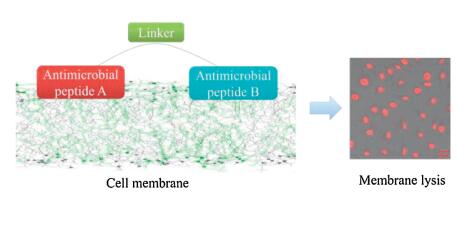 Dimerization is an effective strategy for designing antimicrobial peptides that combine the advantages of different native peptides. In this study, we explored the effects of different linker amino acids, including leucine, proline and aminocaproic acid, on the anticancer, antimicrobial and hemolytic activities of the heteromeric antimicrobial peptides AM-1, AM-2, and AM-3. Proline and aminocaproic acid are ideal linkers for increasing the potency and selectivity of heteromeric antimicrobial peptides. The results of MD simulations provided a rationalization for this observation. Both AM-2, which had a proline linker, and AM-3, which had an aminocaproic acid linker, adopted a compact conformation in water and a bent conformation in membranes. This change in the flexible structures of AM-2 and AM-3 could have resulted in decreased binding of these peptides to zwitterionic lipid bilayers and increased damage to mixed lipid bilayers containing acidic phospholipids. In short, these findings obtained via assessing the effects of linker amino acids will contribute to the design of ideal heteromeric antimicrobial peptides with high selectivity and potency.