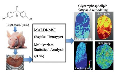 Bisphenol A (BPA) plays an important role in metabolic disorders. As a major alternative to BPA, it is unclear whether the exposure of bisphenol S (BPS) may result in lipidome disturbance. Using a mouse model, we investigated the effects of BPS exposure on metabolism and spatial distribution of lipids by using lipidomics analysis and matrix-assisted laser desorption/ionization (MALDI)-mass spectrometry imaging (MSI) in mouse liver tissues. Lipid metabolites displayed significant up-regulation in phosphatidylethanolamines (PE), lysophosphatidylcholines (LPC), lysophosphatidylethanolamines (LPE) and lysophosphatidylserine (LPS) as well as remarkable down-regulation in phosphatidylcholine (PC) and phosphatidylserine (PS) in mouse liver after the exposure at 100μg BPS/kg body weight/day. The obtained results indicated that the lipidome of liver was perturbed significantly in glycerophospholipid (GP) fatty acid remodeling pathway upon the BPS exposure. We applied MSI and multivariate statistical analysis to evaluate the abundance variation of lipid markers in BPS-treated liver sections and to compare with the analytical results from olive oil-treated liver sections. Differential structural lipids with up-regulated PE (20:1/20:4), LPC (20:4), LPE (20:4), LPS (33:4) and down-regulated PC (20:4/22:6) and PS (18:0/22:6), which were related to GP fatty acid remodeling, changed and co-localized in the liver sections. To explore the cause of variation of lipid abundance, expression of enzymes that regulate biosynthesis and metabolism of fatty acid in liver tissues were analyzed. Consistent with the results of liver lipidome and spatial distribution, a decrease in hepatic expression of LPC acyltransferase 1 (LPCAT1), LPCAT2 and LPS acyltransferase and an increase expression of LPCAT3, LPCAT4, LPE acyltransferase 1 (LPEAT1), LPEAT2 and phospholipase A2 s were observed in GP fatty acid remodeling pathway. Our results demonstrated that exposure to BPS could induce the GP fatty acid remodeling, which might be useful in toxicity evaluation for bisphenols-induced hepatic diseases.