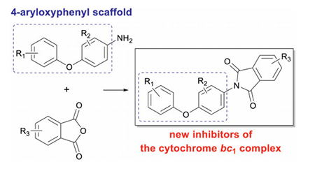 The cytochrome bc1 complex (the bc1 complex or complex Ⅲ) is an attractive target for the discovery of numerous pharmaceuticals and pesticides. In order to identify new lead structures for this target, a new series of molecules, N-(4-aryloxyphenyl)phthalimides, were designed and synthesized in a straightforward manner. Our design strategy was to introduce a 4-aryloxyphenyl group, a fragment which exhibited promising bc1 complex-inhibiting properties, into the aryl group of the valuable N-arylphthalimide backbone. Afterward, the biochemical evaluation of the newly synthesized compounds was carried out, and the results implied that several compounds demonstrated good activities against succinatecytochrome reductase (SCR, a mixture of mitochondrial complex Ⅱ and the bc1 complex). Further studies confirmed that 3e', a representative compound in this paper, was identified as an inhibitor of the bc1 complex. Furthermore, computational simulations were also performed to better understand binding of 3e' to the enzyme complex, which indicated that 3e' should bind to the Qo site of the bc1 complex. Consequently, we harbor the idea that this paper can provide a solid platform for synthesis and discovery of other bc1 complex inhibitors.