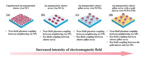 Creating hotspots with significantly enhanced electromagnetic (EF) field, efficiently placing target molecules in hotspot region, and achieving uniform and reproducible Raman signals are three critical issues for developing high-performance SERS substrates. In this work, large area gold nanoparticle cluster pillar array with a gold mirror at bottom was facilely fabricated by combined use of nanosphere lithography and self-assembly approach. It is both theoretically and experimentally found that through multiple coupling interactions, the electromagnetic fields at interparticle gaps within the gold clusters were significantly enhanced in our three-dimentional (3D) pillar array substrates, which can result in one order of magnitude stronger as compared with random gold clusters on a two-dimentional planar case. Due to the periodic stucture, our substrates also possess the capbility of producing highly uniform and reproducible SERS signals. Attractively, in our case, a photoresponsive polymer was used for the formation of pillar array structure. Its unique photoinduced deformation makes it possible to reversibly open and close the gaps of the closely packed Au NP array, thus enabling efficient placement or entrapment of probe molecules into hotspot sites between adjacent nanoparticles.