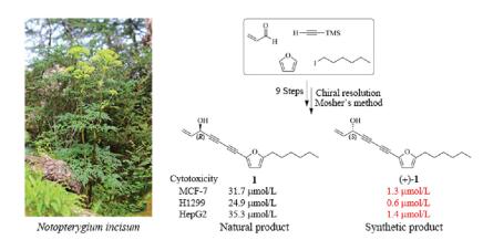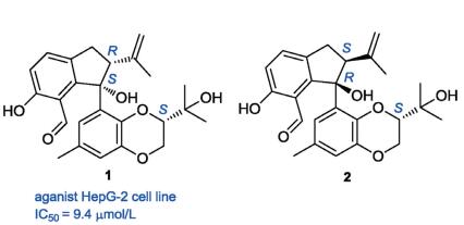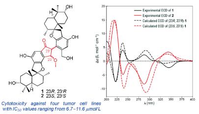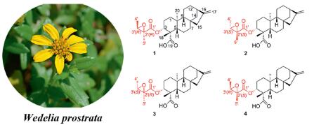 Four new ent-kaurane diterpenes with chiral epoxyangelate moieties, (2'R,3'R)-3α-(2',3'-epoxyangeloyloxy)-kaur-16-en-19-oic acid (1), (2'S,3'S)-3α-(2',3'-epoxyangeloyloxy)-kaur-16-en-19-oic acid (2), (2'S,3'S)-3α-(2',3'-epoxyangeloyloxy)-kaur-16-en-19-oic acid (3) and (2'R,3'S)-3α-(2',3'-epoxyangeloyloxy)-kaur-16-en-19-oic acid (4), along with eight known diterpenes (5-12), were isolated from Wedelia prostrata. The absolute configurations of the new structures were determined by X-ray crystallography, ECD calculations and chemical methods. All compounds were evaluated for their cytotoxicity activities on human HepG-2 cells, with IC50 values of 11.72±0.22 μmol/L to 54.75±1.12 μmol/L.