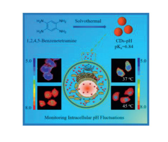 Intracellular pH plays a significant role in various biological processes, including cell proliferation, apoptosis, metabolism, enzyme activity and homeostasis. In this work, a novel design strategy for the preparation of pH responsive carbon dots (CDs-pH) for ratiometric intracellular imaging was reported. By using SciFinder database, fluorescent CDs-pH with the required pKa value of 6.84 were rationally designed, which is vital important for precise sensing of intracellular pH. As a result, the synthesized CDspH demonstrated robust ability to test pH fluctuations within the physiological range of 5.4-7.4. The CDspH was further utilized for fluorescent ratiometric imaging of pH in living HeLa cells, effectively avoided the influence of autofluorescence from native cellular species. Moreover, real-time monitoring of intracellular pH fluctuation under heat shock was successfully realized. This SciFinder-guided design strategy is simple and flexible, which has a great potential to be used for the development of other types of CDs for various applications.