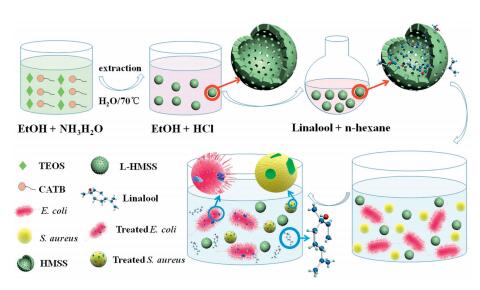 To develop a novel food preservation technology for efficiently enhance bactericidal activity in a long term, hollow mesoporous silica spheres (HMSS) with regular nanostructures were applied to encapsulate natural organic antimicrobial agents. The chemical structures, morphologies and thermal stabilities of linalool, HMSS and linalool-functionalized hollow mesoporous silica spheres (L-HMSS) nanoparticles were evaluated by polarimeter, field emission scanning electron microscope (FE-SEM), transmission electron microscope (TEM), fourier transform infrared (FT-IR), thermal gravimetric analyzer (TGA), nitrogen adsorption-desorption, zeta potential and small angle X-ray diffraction (SXRD). The results show that the linalool was successfully introduced into the cavities of HMSS, and the inorganic host exhibited a high loading capacity of about 1500 mg/g. In addition, after 48 h of incubation, the minimum bactericidal concentrations (MBC) of L-HMSS against Escherichia coli (E. coli), Salmonella enterica (S. enterica) and Staphylococcus aureus (S. aureus), Listeria monocytogenes (L. monocytogenes) were decreased to be 4 (< 5) mg/mL and 8 (< 10) mg/mL, respectively. These results revealed linaloolfunctionalized hollow mesoporous spheres could efficiently improve the bactericidal activities of the organic component. Furthermore, SEM images clearly showed that L-HMSS indeed had an extremely inhibitory effect against gram-negative (E. coli) and gram-positive (S. aureus) by breaking the structure of the cell membrane. This research is of great significance in the application of linalool in nano-delivery system as well as food industry.