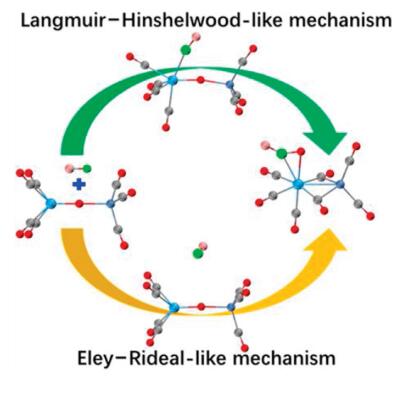 The series of heterodinuclear metal oxide carbonyls in the form of TaNiO(CO)n- (n = 5–8) are generated in the pulsed-laser vaporization source and characterized by mass-selected photoelectron velocity-map spectroscopy. During the consecutive CO adsorption, the μ2-O-bent structure initially is the most favorable for TaNiO(CO)5-, and subsequently both μ2-O-bent and μ2-O-linear structures are degenerate for TaNiO(CO)6-, then the μ2-O-linear structure is most preferential for TaNiO(CO)7-, and finally the η2-CO2-tagged structure is the most energetically competitive one for TaNiO(CO)8-, i.e., the CO oxidation occurs at n = 8. In contrast to the literature reported CO oxidation on heteronuclear metal oxide complexes generally proceeding via Langmuir–Hinshelwood-like mechanism, complementary theoretical calculations suggest that both Langmuir–Hinshelwood-like and Eley–Rideal-like mechanisms prevail for the CO oxidation reaction on TaNiO(CO)8- complex. Our findings provide new insight into the composition-selective mechanism of CO oxidation on heteronuclear metal complexes, of which the composition be tailored to fulfill the desired chemical behaviors.