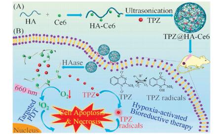 Currently, architecting a rational and efficient nanoplatform combing with multi-therapeutic modalities is highly obligatory for advanced cancer treatment. In order to remedy the self-limiting hypoxic dilemma of photodynamic therapy (PDT), herein, a facile photosensitizer (i.e., chlorin e6, Ce6) and bioreductive prodrug (i.e., tirapazamine, TPZ)-coloaded hyaluronic acid (HA) nanomicelles (denoted as TPZ@HA-Ce6) was developed for the cascading mode of photo-bioreductive cancer therapy. Taking the typical advantage of Ce6 coupled HA conjugate, TPZ was easily and successfully accommodated into the hydrophobic core of HA-Ce6 nanomicelles, yielding TPZ@HA-Ce6. It showed good dispersibility and stability with the hydrodynamic size of ca. 170 nm. It targeted the CD44 overexpressed cancer cells by receptor-mediated endocytosis way and killed them effectively with singlet oxygen and the subsequent TPZ radicals resulting from the oxygen depletion of PDT. The later was further verified by the hypoxia probe in vivo. Using murine mammary carcinoma 4T1 model, TPZ@HA-Ce6 nanomicelles exhibited cascading and synergistic anticancer effect of PDT and TPZ bioreductive therapy compared with each monotherapy. This work suggests the promising prospect of the hybrid hyaluronic nanomicelles for highly efficient cancer combination treatment.
