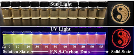 Up to date, solid-state carbon dots (CDs) with bright red fluorescence have scarcely achieved due to aggregation-caused quenching (ACQ) effect and extremely low quantum yield in deep-red to near infrared region. Here, we report a novel fluorine-defects induced solid-state red fluorescence (λem = 676 nm, the absolute fluorescence quantum yields is 4.17%) in fluorine, nitrogen and sulfur co-doped CDs (F,N,S-CDs), which is the first report of such a long wavelength emission of solid-state CDs. As a control, CDs without fluorine-doping (N,S-CDs) show no fluorescence in solid-state, and the fluorescence quantum yield/emission wavelength of N,S-CDs in solution-state are also lower/shorter than that of F,N,S-CDs, which is mainly due to the F-induced defect traps on the surface/edge of F,N,S-CDs. Moreover, the solid-state F,N,S-CDs exhibit an interesting temperature-sensitive behavior in the range of 80-420 K, with the maximum fluorescence intensity at 120 K, unveiling its potential as the temperature-dependent fluorescent sensor and the solid-state light-emitting device adapted to multiple temperatures.