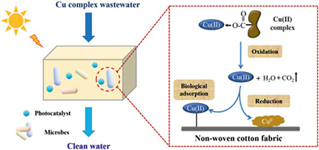 The efficient remediation of heavy metal complexes in water has become a difficult and challenging task owing to their high stability and strong mobility. In this study, a novel strategy was employed for highly efficient removal of Cu-citrate by using intimately coupled photocatalysis and biodegradation (ICPB) system with non-woven cotton fabric as a carrier. Experimental results showed that the ICPB system caused 94% Cu removal, which was higher than those of single photocatalysis. After 5 cycles, Cu removal efficiency could still reach 78% within 5 h. The existence of 0–40 mg/L citrate had negligible influence, whereas the presence of 60–100 mg/L citrate exhibited a limited adverse effect on Cu removal (~70%). The decomplexation of Cu-citrate was realized via the function of free radicals and microorganisms. Two main processes, such as bio-adsorption of Cu2+ by microorganisms, deposition of Cu0 on the surface of material, played important role in Cu removal from aqueous solution. The dominant microorganisms in the system were Proteobacteria, Actinobacteria, Bacteroidetes, Chloroflexi, Chlorophyta, Planctomycetes, and Verrucomicrobia. Furthermore, the performance of ICPB system was also validated through treatment of other heavy metal complexes. This study provided a feasible strategy for the decontamination of heavy metal complexes in wastewater.