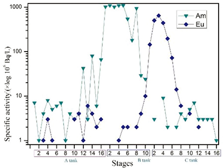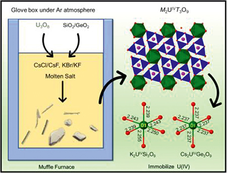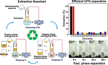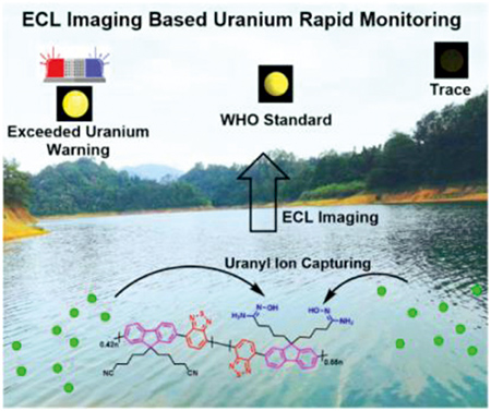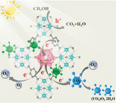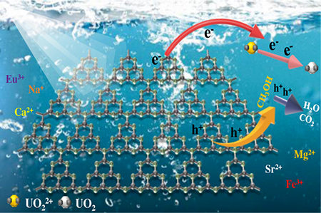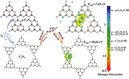 Nitrogen enrichment and increased nitrogen content is an effective strategy for enhancing adsorption of uranium by carbon nitride polymers. Herein, we reported the uranium absorption by using a structurally well-defined and nitrogen-rich carbon nitride polymer with C3N5 stoichiometry for the first time. In comparison with the adsorption performance of g-C3N4 for U(VI), the conjugation system of the material was increased by connecting the heptazine unit through the azo bridge in the structure of C3N5, so that C3N5 exhibited several times higher adsorption performance than that of g-C3N4. The C3N5 has high kinetics for uranyl ions, which can adsorb 100 mg/g U(VI) in only 10 min and reach complete adsorption equilibrium in 60 min; the theoretical maximum adsorption capacity is 207 mg/g, meanwhile, the material exhibits high selectivity. The results of spectral analysis and theoretical calculations indicate that the process of uranyl ion capture by C3N5 is a combination of physical and chemical adsorption, and its higher density of electronic states makes the electrostatic binding ability enhanced, which is favorable to the adsorption of uranyl ions by C3N5. This work indicates that C3N5 has great promise and application in the separation and enrichment of uranyl ions, and also provides a reference for the systematic investigation of the adsorption ability of nitrogen-rich carbon nitrogen polymers on uranyl ions.