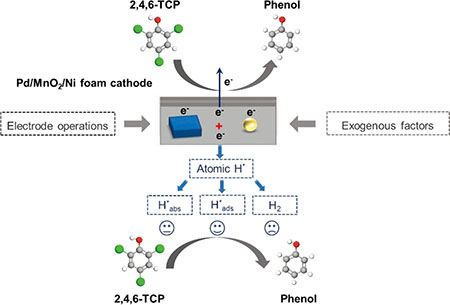 Pd modified electrodes possess problems such as easy agglomeration and low electrolytic ability, and the use of manganese dioxide (MnO2) to facilitate Pd reduction of organic pollutants is just started. However, there is still a limited understanding of how to match the Pd load and MnO2 to realize optimal dechlorination efficiency at minimum cost. Here, a Pd/MnO2/Ni foam cathode was successfully fabricated and applied for the efficient electrochemical dechlorination of 2,4,6-trichlorophenol (2,4,6-TCP). The optimal electrocatalytic hydrodechlorination (ECH) performance with 2,4,6-TCP dechlorination efficiency (92.58% in 180 min) was obtained when the concentration of PdCl2 precipitation was 1 mmol/L, the deposition time of MnO2 was 300 s and cathode potential was -0.8 V. Performance influenced by the exogenous factors (e.g., initial pH and coexisted ions) were further investigated. It was found that the neutral pH was the most favorable for ECH and a reduction in dechlorination efficiency (6%~47.6%) was observed in presence of 5 mmol/L of NO2-, NO3-, S2- or SO32-. Cyclic voltammetry (CV) and quenching experiments verified the existence of three hydrogen species on Pd surface, including adsorbed atomic hydrogen (H*ads), absorbed atomic hydrogen (H*abs), and molecular hydrogen (H2). And the introduction of MnO2 promoted the generation of atomic H*. Only adsorbed atomic hydrogen (H*ads) was confirmed that it truly facilitated the ECH process. Besides H*ads induced reduction, the direct reduction by cathode electrons also participated in the 2,4,6-TCP dechlorination process. Pd/MnO2/Ni foam cathode shows excellent dechlorination performance, fine stability and recyclable potential, which provides strategies for the effective degradation of persistent halogenated organic pollutants in groundwater.