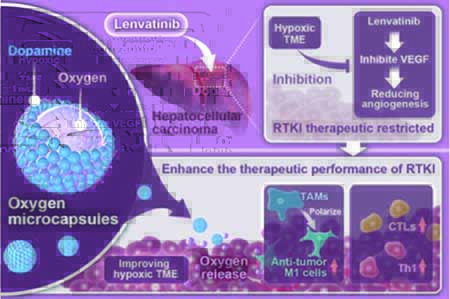 Hypoxia is a typical characteristic of hepatocellular carcinoma (HCC), which causes tremendous obstacles to tumor treatments. Current first-line treatment may further deteriorate tumor hypoxia. For example, Lenvatinib, a receptor tyrosine kinase inhibitor (RTKI), suppresses tumor growth via blocking vascular endothelial growth factor (VEGF) signaling, and can also inhibit angiogenesis, thus limiting oxygen supply to tumor sites. Therefore, alleviating tumor microenvironment (TME) hypoxia holds great potential for enhancing the therapeutic effect of RTKI. Here, nanoparticle-stabilized oxygen microcapsules, a stable and biocompatible oxygen-loaded delivery system, are successfully prepared through interfacial polymerization of polydopamine nanoparticles. The microcapsules with a large loading capacity of oxygen in the core show excellent bioavailability and dispersity, which could effectively improve the hypoxic TME when they serve as oxygen delivery vehicles. Synergetic treatments of Lenvatinib and oxygen microcapsules could induce the transition of “cold tumor” in an immune-suppressed state to “hot tumor” in an immune-activated state by improving tumor hypoxic TME and reducing angiogenesis in HCC. It is revealed that combined treatments of oxygen microcapsules and Lenvatinib could polarize tumor-associated macrophages (TAMs) to anti-tumor M1 cells and activate T cell-mediated anti-tumor immune responses. The results suggest that synergetic therapy using oxygen microcapsules and Lenvatinib could alleviate the hypoxic TME and enhance the therapeutic performance of RTKI, demonstrating a promising anti-tumor strategy for enhanced therapy of HCC.