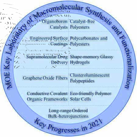In 2021, The MOE Key Laboratory of Macromolecular Synthesis and Functionalization in Zhejiang University had achieved several important results. First, a series of versatile organoboron catalysts were synthesized for ring-opening (co)polymerizations. Second, a catalyst-free polycondensation mechanism was proposed for the production of polyesters with high molecular weights. Third, a co-assembly method that can fabricate films and coatings with controllable structures and properties on various substrates was demonstrated, providing a platform for the construction of novel surface coatings. Forth, facile methods for producing high-productivity poly(propylene carbonate) and semicrystalline polyester have been discovered. And linear non-conjugated polyesters exhibiting yellow-green clusteroluminescence were developed for the first time. Fifth, a supramolecular prodrug nano-assembly strategy has been developed for reactive nitrogen species potentiated chemotherapy. Sixth, a series of tough and stiff supramolecular hydrogels with shape memory properties have been used for information encryption. Seventh, reversible fusion and fission of wet-spun graphene oxide fibers has been successfully achieved. Eighth, three non-conjugated polypeptides were synthesized and the mechanism of clusteroluminescence was studied. Ninth, a series of conducting covalent organic frameworks with high electrical conductivity and carrier mobility have been used as high-performance chemiresistor, electrocatalyst, and organic field-effect transistor. Tenth, the exploration of non-fused electron acceptors, and their photostable mechanism are exemplified for developing high-performance, low-cost and eco-friendly polymer solar cells. Finally, gel-grown long-range ordering bulk-heterojunctions has achieved improved X-ray detector performance.