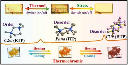 Multifunctional switchable materials are attracting tremendous interest because of their great application potential in signal processing, information encryption, and smart devices. Here, we reported an organic-inorganic hybrid thermochromic ferroelastic crystal, [TMIm][CuCl4] (TMIm = 1,1,3,3-tetramethylimidazolidinium), which undergoes two reversible phase transitions at 333 K and 419 K, respectively. Intriguingly, these three phases experience a remarkable ferroelastic-paraelastic-ferroelastic (2/m-mmm-2/m) transition, which remains relatively unexplored in ferroelastics. Moreover, the ferroelastic domains can be simultaneously switched under temperature and stress stimuli. Meanwhile, [TMIm][CuCl4] exhibits thermochromic phenomenon, endowing it with extra spectral encryption possibilities during information processing. Combined with dielectric switching behavior, [TMIm][CuCl4] are promising for practical applications in memory devices, next-generation sensors, and encryption technology.