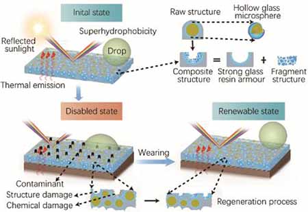 Passive daytime radiative cooling (PDRC) technology is emerging as one of the most promising solutions to the global problem of spacing cooling, but its practical application is limited due to reduced cooling effectiveness caused by daily wear and tear, as well as dirt contamination. To tackle this problem, we report a novel strategy by introducing a renewable armor structure for prolonging the anti-fouling and cooling effectiveness properties of the PDRC coatings. The armor structure is designed by decorating fluorinated hollow glass microspheres (HGM) inside rigid resin composite matrices. The HGM serve triple purposes, including providing isolated cavities for enhanced solar reflectance, reinforcing the matrices to form robust armored structures, and increasing thermal emittance. When the coatings are worn, the HGM on the surface expose their concave cavities with numerous hydrophobic fragments, generating a highly rough surface that guarantee the superhydrophobic function. The coatings show a high sunlight reflectance (0.93) and thermal emittance (0.94) in the long-wave infrared window, leading to a cooling of 5 ℃ below ambient temperature under high solar flux (~900 W/m2). When anti-fouling functions are reduced, they can be regenerated more than 100 cycles without compromising the PDRC function by simple wearing treatment. Furthermore, these coatings can be easily prepared using a one-pot spray method with low-cost materials, exhibit strong adhesion to a variety of substrates, and demonstrate exceptional environmental stability. Therefore, we anticipate their immediate application opportunities for spacing cooling.