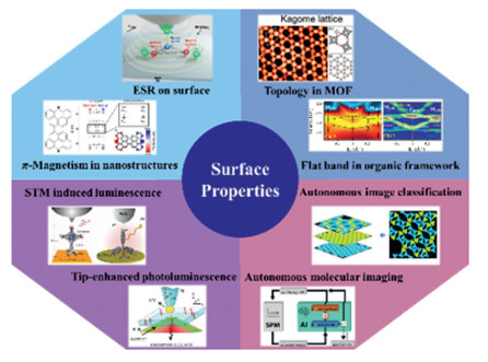 Surface with well-defined components and structures possesses unique electronic, magnetic, optical and chemical properties. As a result, surface chemistry research plays a crucial role in various fields such as catalysis, energy, materials, quantum, and microelectronics. Surface science mainly investigates the correspondence between surface property and functionality. Scanning probe microscopy (SPM) techniques are important tools to characterize surface properties because of the capability of atomic-scale imaging, spectroscopy and manipulation at the single-atom level. In this review, we summarize recent advances in surface electronic, magnetic and optical properties characterized mainly by SPM-based methods. We focus on elucidating the π-magnetism in graphene-based nanostructures, construction of spin qubits on surfaces, topology properties of surface organic structures, STM-based light emission, tip-enhanced Raman spectroscopy and integration of machine learning in SPM studies.