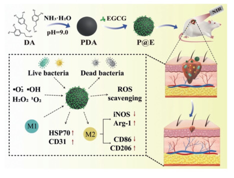 Infectious wound healing is complicated with and limited by infection and oxidative stress at the wound site. In recent years, various evidences suggest that nanozymes with multiple enzymatic activities have enabled the development of novel strategies for infectious wound healing. In this study, epigallocatechin gallate loaded polydopamine (P@E) was developed to act as a potent reactive oxygen species (ROS) scavenger for scavenging ROS, alleviating inflammatory responses, and promoting infectious wound healing. Combining with near infrared (NIR) irradiation, P@E presented excellent antibacterial ability of Escherichia coli (E. coli, 93.6%) and methicillin-resistant Staphylococcus aureus (MRSA, 87.6%). Specifically, P@E+NIR exhibited the most potent antioxidant, anti-inflammatory and cell proliferation behaviors through down-regulating intracellular ROS levels (81.9% and 94.3% for NIH3T3 and RAW264.7 respectively) and inducible nitric oxide synthase (iNOS) expression level (55.7%), and up-regulating the expression levels of arginase-1 (Arg-1, 71.4%), heat shock protein 70 (HSP70, 48.6%) and platelet endothelial cell adhesion molecule (CD31, 35.3%) compared to control group. Meanwhile, it also efficiently induced M2 directional polarization of lipopolysaccharide induced murine macrophages to achieve anti-inflammation, indicated by the down-regulation of CD86 (86.2%), and up-regulation of CD206 (85.6%). Significantly, it was also observed that P@E+NIR presented the excellent behaviors of inhibiting wound infection, alleviating wound inflammation, as well as promoting skin tissue repairing. Altogether, it has developed the strategy of using P@E combining with NIR irradiation for the synergistic enhanced healing of infectious skin wound, which can serve as a promising therapeutic strategy for its clinical treatment.