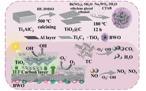 As a semiconductor material with inorganic functional properties, titanium dioxide (TiO2) demonstrates exceptional optical, electrical, and catalytic characteristics. The catalytic performance of TiO2 is notably affected by the proportion of anatase to rutile within its mixed phase, which plays a crucial role in modulating its performance. The phase transition in TiO2 enhances the effective separation of photogenerated charge carriers, thereby improving their utilization. In this study, we present an efficient and proportionally adjustable TiO2 phase transition strategy induced by near-infrared light (NIR light) utilizing TiO2 and titanium carbide (TiC) composites. Notably, the transition ratio of anatase to rutile phases can be adjusted by controlling the NIR light irradiation time in 1s intervals (within 6 s), resulting in conversion rates of 5.88%, 13.29%, 20.42%, 26.02%, 32.8% and 40.12%, respectively. This capability for tunable ratios is attributed to the photothermal effect of TiC, which converts to anatase at higher temperatures while simultaneously promoting the layer-by-layer aggregation of adjacent anatase grains, thereby facilitating the phase transition. In addition, we assessed the photocatalytic efficiency of tetracycline hydrochloride (TCHCl, an antibiotic) and methylene blue (MB, a dye) when exposed to visible light using different ratios of obtained phase junctions. The findings revealed that after a brief 3 s exposure to laser sintering, the weight fractions of rutile and anatase TiO2 were approximately 0.2 and 0.8, respectively. This specific ratio of phase transition exhibits superior photocatalytic performance compared to alternative phase transition ratios. The creation of heterojunctions in anatase/rutile TiO2 facilitated greater oxygen adsorption and heightened the density of localized states, thus effectively boosting the production of superoxide radicals (·O2-) and hole (h+) species. The phase junction of TiO2 shows significant potential for application in wastewater treating, resulting in improved photocatalytic degradation of pollutants and highlighting its efficacy in environmental pollution control.