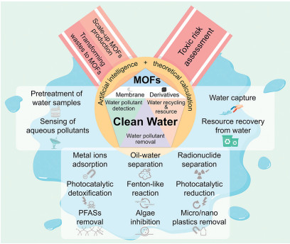 This review comprehensively summarizes the latest advancements in the synthesis and multifaceted applications of metal-organic frameworks (MOFs) for clean water. It systematically explores scalable synthesis methods, from solvothermal to green mechanochemical routes, and highlights the innovative transformation of waste into high-value MOFs. The article delves into the diverse functionalities of MOFs in water remediation, including the adsorptive and catalytic removal of heavy metals, organic pollutants, pharmaceuticals, PFASs, and micro/nano-plastics. Applications in sensing, radionuclide separation, oil-water separation, and advanced membrane technologies are also detailed. Furthermore, emerging roles in water capture, algal inhibition and resource recovery are discussed. Finally, the review provides a critical perspective on future challenges and opportunities, emphasizing sustainable synthesis, life-cycle assessment, and the integration of AI for the intelligent design of next-generation MOFs, paving the way for their transition from laboratory research to real-world water treatment solutions.