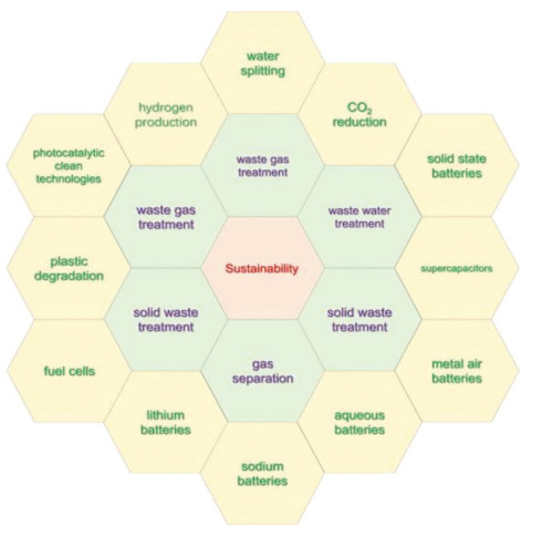 Sustainable development for our life is important task, which is driven by key materials and technologies. In this roadmap, we discuss three main aspects in addressing environmental questions, green chemical processes and energy challenges. They are included, such as gas treatment and separation, wastewater treatment, waste gas treatment, solid waste treatment, lithium extraction, hydrogen production, water splitting, CO2 reduction, photocatalytic clean technologies, plastic degradation, fuel cells, lithium batteries, sodium batteries, aqueous batteries, solid state batteries, metal air batteries and supercapacitors. Their status, challenges, progress and future perspectives are also discussed. We hope that this paper can give clear views on sustainable development in materials and technologies.